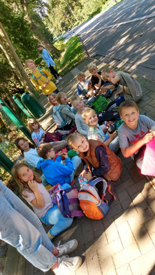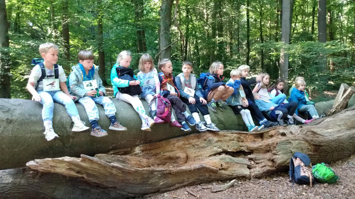 Dann gab es für die Klasse ein gemeinsames Frühstück mitten im Grünen. Zwischen hohen Bäumen und dem Rascheln der Blätter, packten sie ihre mitgebrachten Leckereien aus. Baumstümpfe und der Waldboden dienten als Sitzgelegenheit.